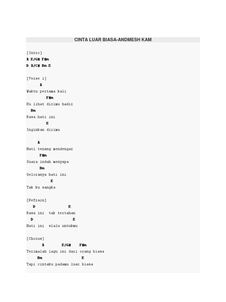 . Inilah lirik dan chord gitar lagu Cinta Luar Biasa yang dinyanyikan oleh Andmesh Kamaleng dan dirilis pada tanggal 2 November 2018. Bila tidak berhasil coba untuk mengilangkan tanda kutip misal. Chord gitar lagu Kunci gitar lagu Andmesh Kamaleng - Cinta Luar Biasa - 308216 Chord capo di fret 2 Intro.